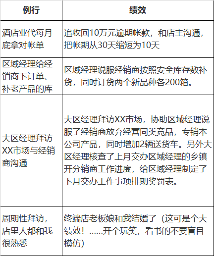 我們到底希望員工做例行,還是做績效?當然希望他們做績效。所以每個終端業(yè)代晚上回來主管要跟他面談今天的“績效”。員工開早會要匯報“績效”。員工拜訪每一個終端出門前要反思“績效”。