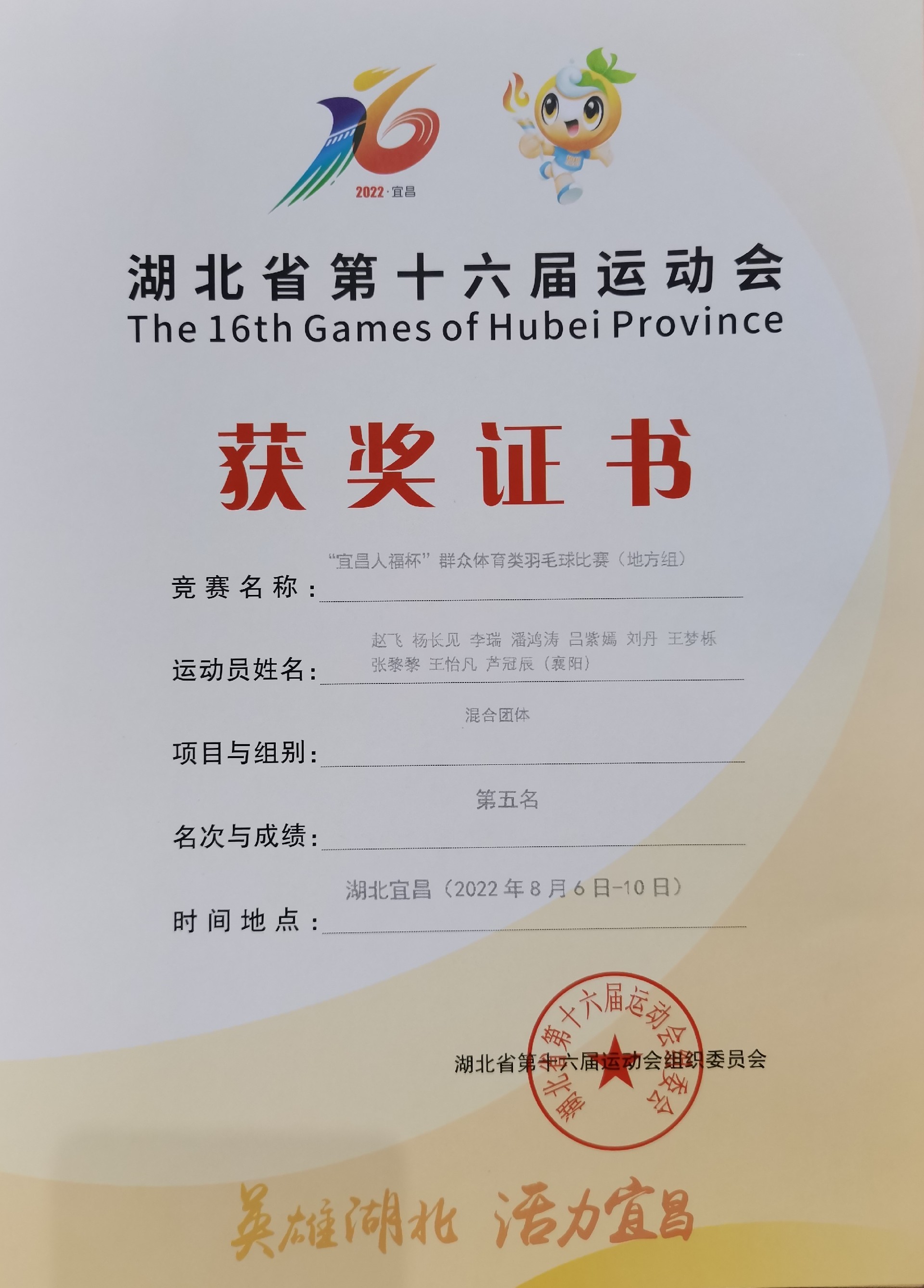 四年磨一劍,一朝展鋒芒。8月6日——10日,湖北省第十六屆運動會“宜昌人福杯”群眾體育類羽毛球比賽(地方組)于宜昌市隆重舉行,來自省內(nèi)一千多位運動健兒齊聚宜昌、共同參賽。經(jīng)過全體隊員的努力拼搏,襄陽羽毛球代表隊榮獲湖北省第十六屆運動會混合團體第五名的好成績,載譽而歸!