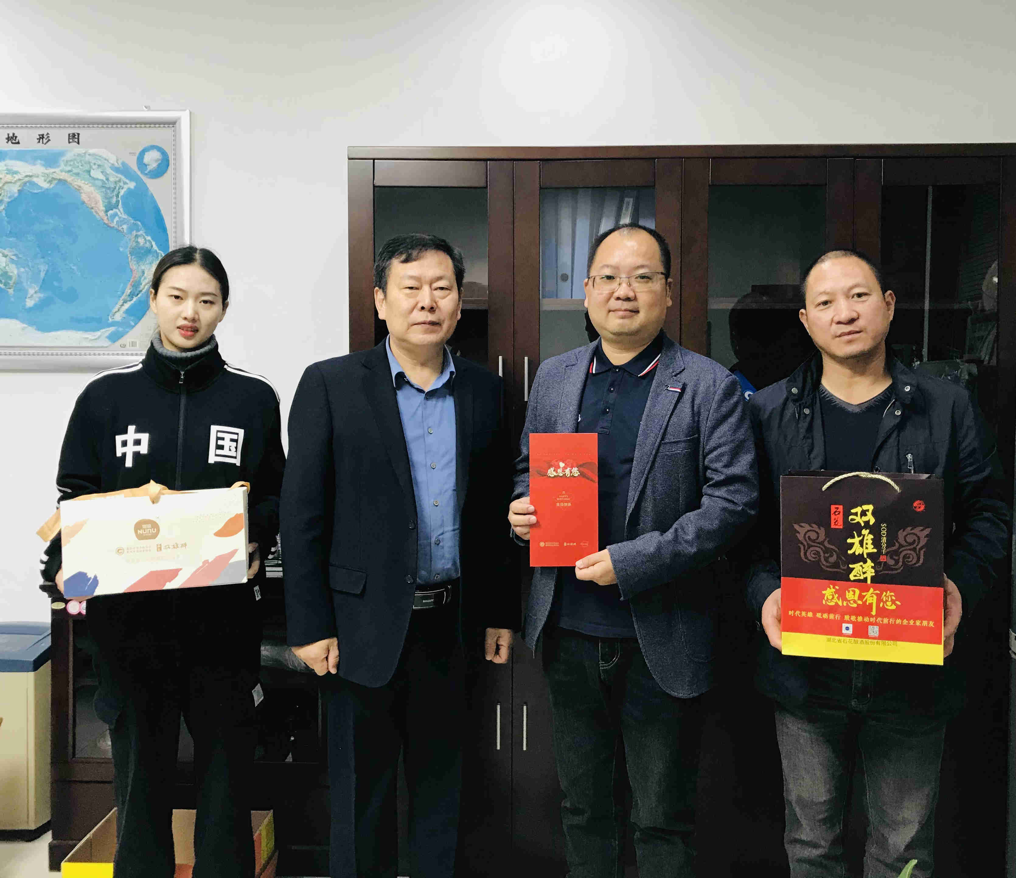 10月21日,得知襄陽世陽電機有限公司董事長張傳輝過生日的消息 ,襄陽企聯(lián)常務副會長兼秘書長趙樂成、雙雄醉大客戶總監(jiān)李愛軍帶著由市領導付勁松副市長、市經(jīng)信局楊富杰局長、市企聯(lián)吳少偉會長簽名的《襄陽英雄 青春永駐》生日賀卡和生日蛋糕以及石花雙雄醉含有SOD的健康白酒,為過生日的張總送上生日祝福,祝您生日快樂!
